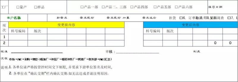 訂單變更單一般由銷售業(yè)務(wù)發(fā)起,PMC調(diào)查匯總;如果變更內(nèi)容在周計劃周期前,則需以補充計劃形式發(fā)布,如果在周計劃周期之后,則需更新SHIIPPING PLAN;訂單變更單模版,如下截圖4:
